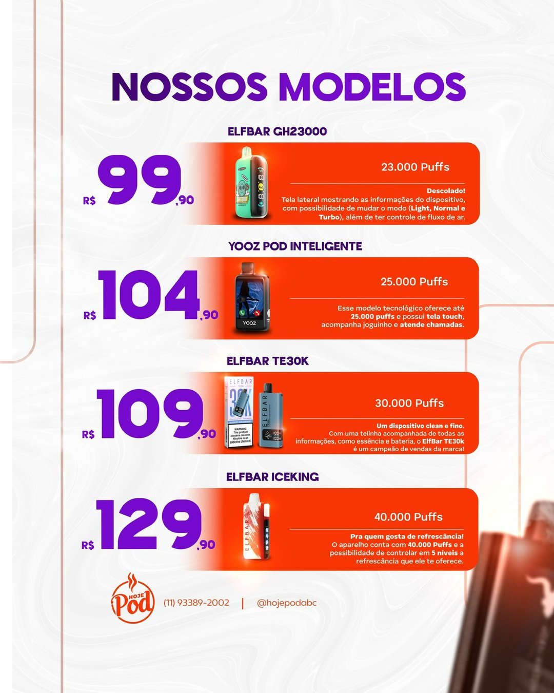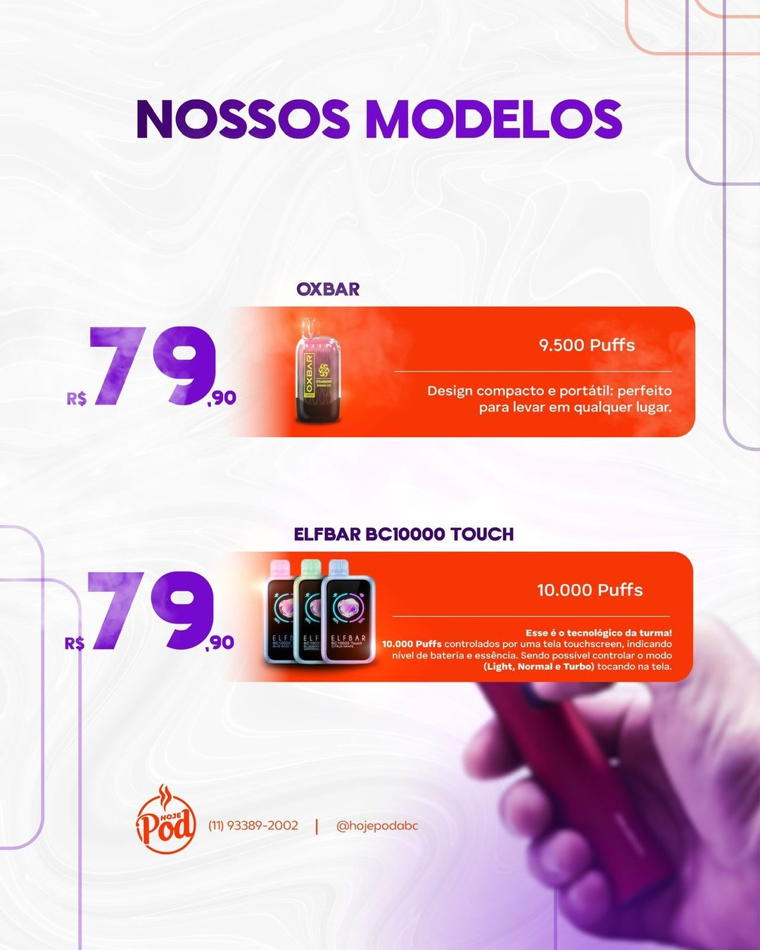 A HojePod é a sua loja de cigarros eletrônicos com entrega rápida e segura em São Caetano do Sul e região! Trabalhamos com as melhores marcas do mercado, como IGNITE, ELFBAR, OXBAR e LOST MARY, garantindo variedade e qualidade para todos os gostos. Priorizamos a sua satisfação, oferecendo atendimento personalizado e preços justos. Conte com a nossa experiência e confiabilidade para encontrar o pod perfeito. Experimente a praticidade e a rapidez da HojePod. Peça já o seu via WhatsApp!